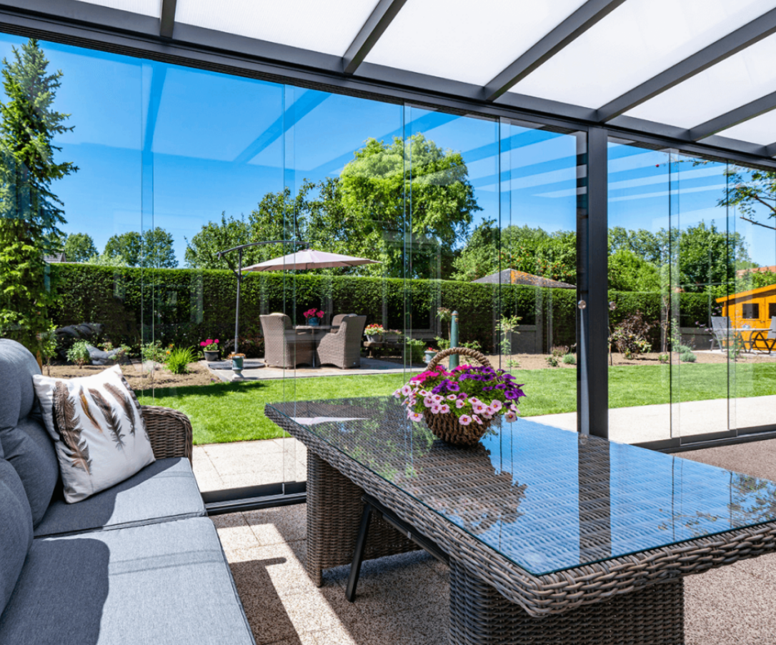 Een (meestal) zwarte overkapping met glazen schuifwanden geeft je een unieke mogelijkheid: je tuin of terras wordt een volwaardige tuinkamer! Deze wanden zorgen voor beschutting tegen wind en regen, terwijl je het buitengevoel behoudt. In de zomer kun je de wanden open schuiven voor een frisse bries, en in de herfst en winter geniet je van een knusse, verwarmde ruimte.